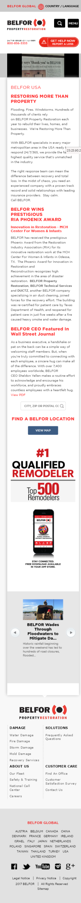 BELFOR Property Restoration is the North American leader in integrated disaster recovery and property restoration services. With more than 100 full-service offices in the U.S., we are geographically positioned to respond to almost any disaster – large or small - coast to coast. A proven track record of superior response and unmatched resources has made BELFOR the contractor of choice for damages caused by fire, water, wind or other catastrophes.