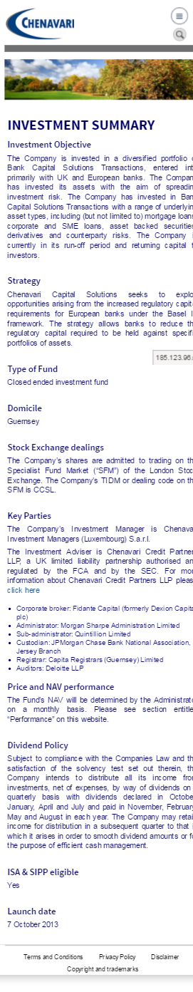 The Company is invested in a diversified portfolio of Bank Capital Solutions Transactions, entered into primarily with UK and European banks. The Company has invested its assets with the aim of spreading investment risk. http://www.chenavaricapitalsolutions.com
