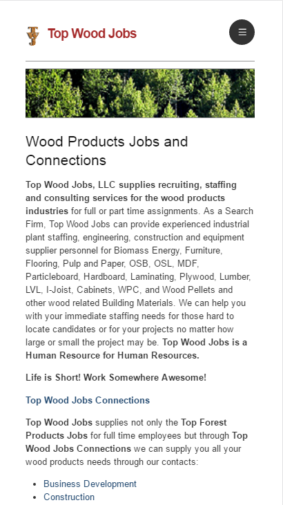 Top Wood Jobs, LLC supplies recruiting, staffing and consulting services for the wood products industries for full or part time assignments. As a Search Firm, Top Wood Jobs can provide experienced industrial plant staffing, engineering, construction and equipment supplier personnel for Biomass Energy, Furniture, Flooring, Pulp and Paper, OSB, OSL, MDF, Particleboard, Hardboard, Laminating, Plywood, Lumber, LVL, I-Joist, Cabinets, WPC, and Wood Pellets and other wood related Building Materials