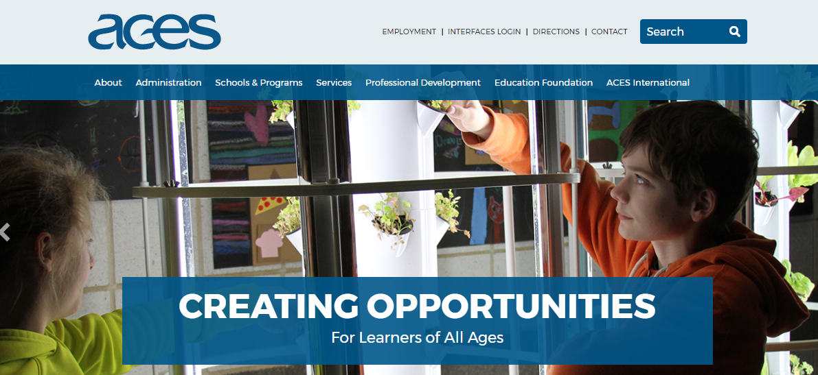 Area Cooperative Educational Services (ACES) La sua missione: Per consentire agli studenti, distretti membri, e altri di affrontare le sfide educative e di vita per quasi cinquant'anni. ACES è il centro regionale di servizi educativi per le venticinque comunità della contea di New Haven. ACES è un'organizzazione senza scopo di lucro e un distretto scolastico che serve oltre 2.000 studenti in tre calamite e cinque scuole di istruzione speciale.