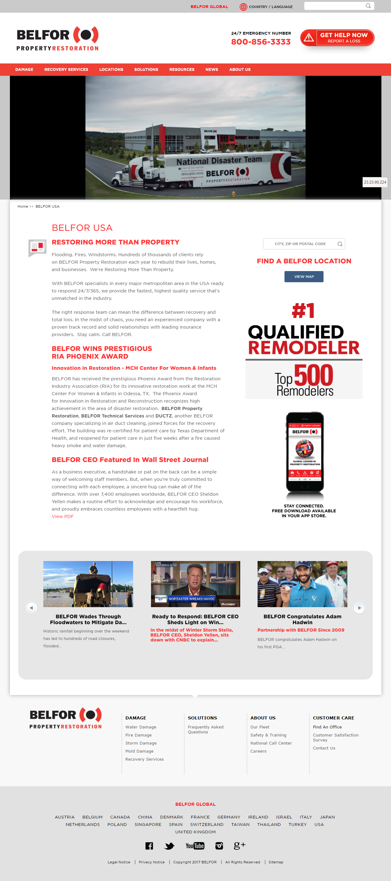 BELFOR Property Restoration è il leader nordamericano in servizi integrati di disaster recovery e ripristino di proprietà. Con più di 100 uffici full-service negli Stati Uniti, siamo posizionati geograficamente per rispondere a quasi tutti i disastri - grandi o piccoli - da costa a costa. Una comprovata esperienza di risposta superiore e di risorse senza pari ha reso BELFOR l'appaltatore scelto per i danni causati da incendi, acqua, vento o altre catastrofi.