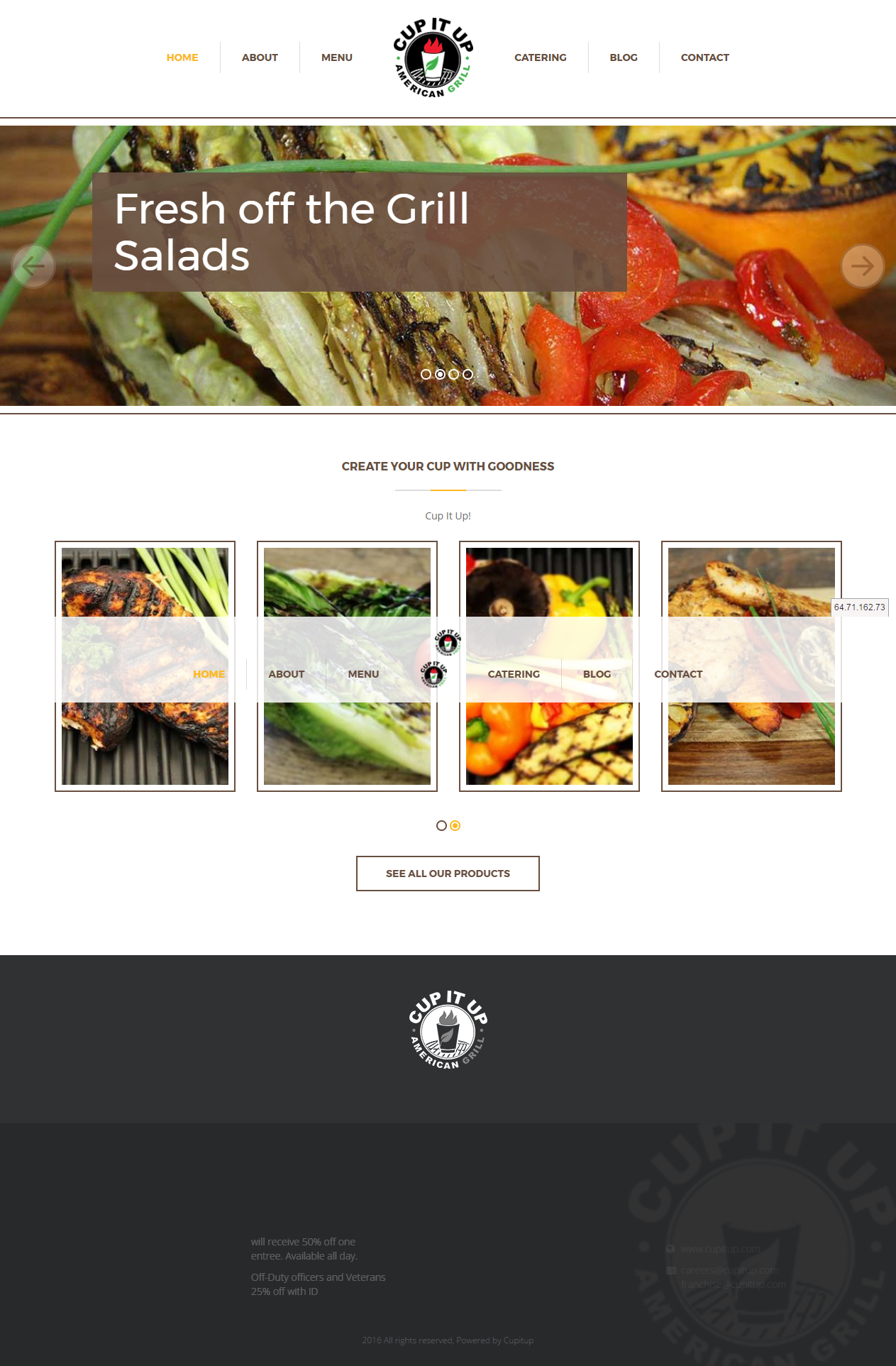 Il concetto di "Cup It Up American Grill" deriva da una necessità di comodità e mobilità. Separando le proteine più popolari, verdure, lati e condimenti, permettiamo al consumatore la scelta finale di opzioni fresche. Tutti gli ingredienti del nostro menu saranno alla griglia o serviti freschi nel loro stato naturale.