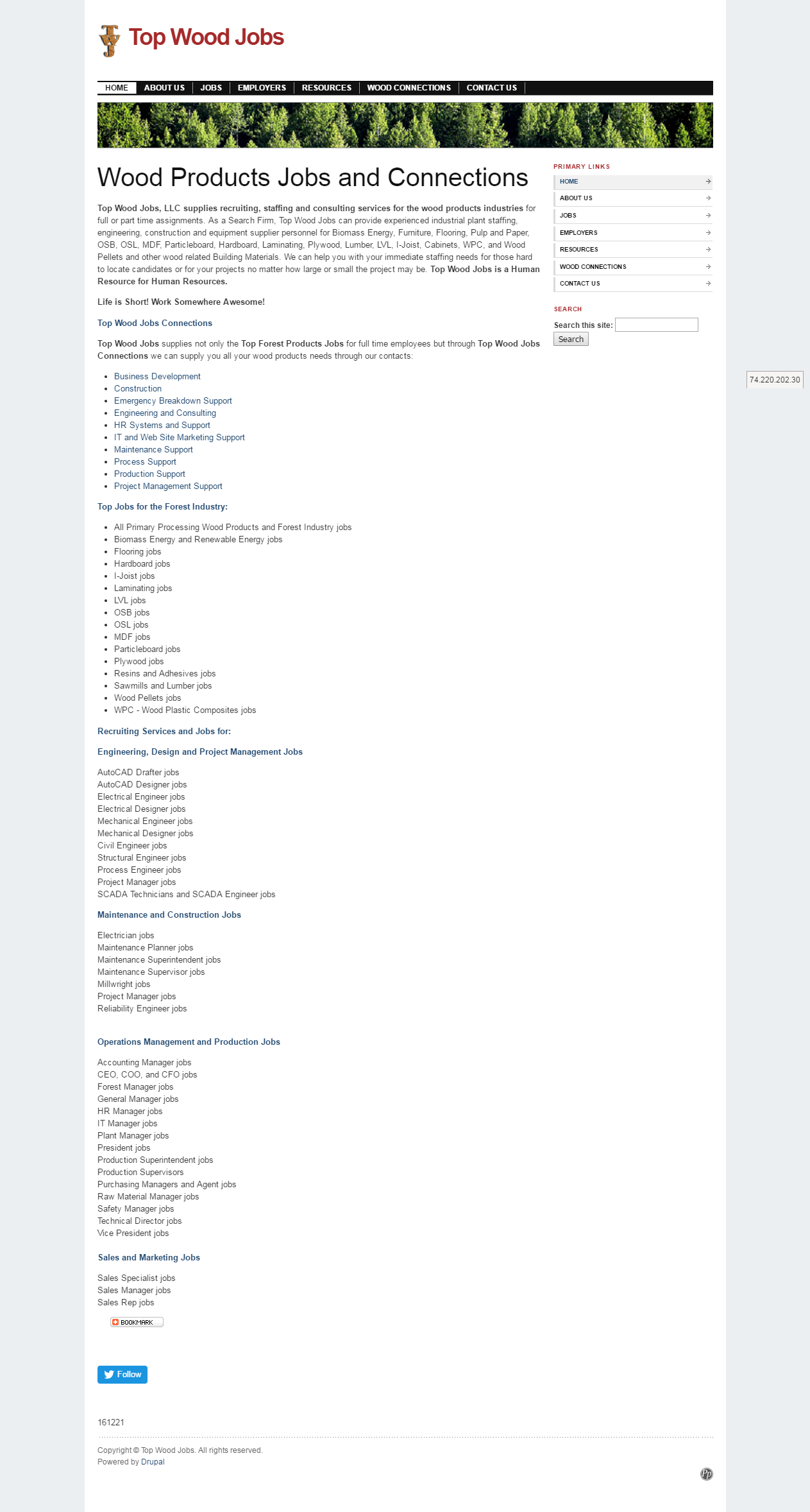 Top Wood Jobs, LLC fornisce servizi di reclutamento, assunzioni e Consulenza per l'industria dei prodotti in legno per incarichi a tempo pieno o part time. Come azienda di ricerca, Top Wood Jobs può fornire personale esperto di impianti industriali, ingegneria, costruzione e fornitore di attrezzature per l'energia biomassa, mobili, pavimenti, pasta e carta, OSB, OSL, MDF, truciolare, cartone, laminazione, compensato, legname, LVL, I-Joist, Armadi, WPC, e pellet di legno e altri materiali da costruzione correlati legno